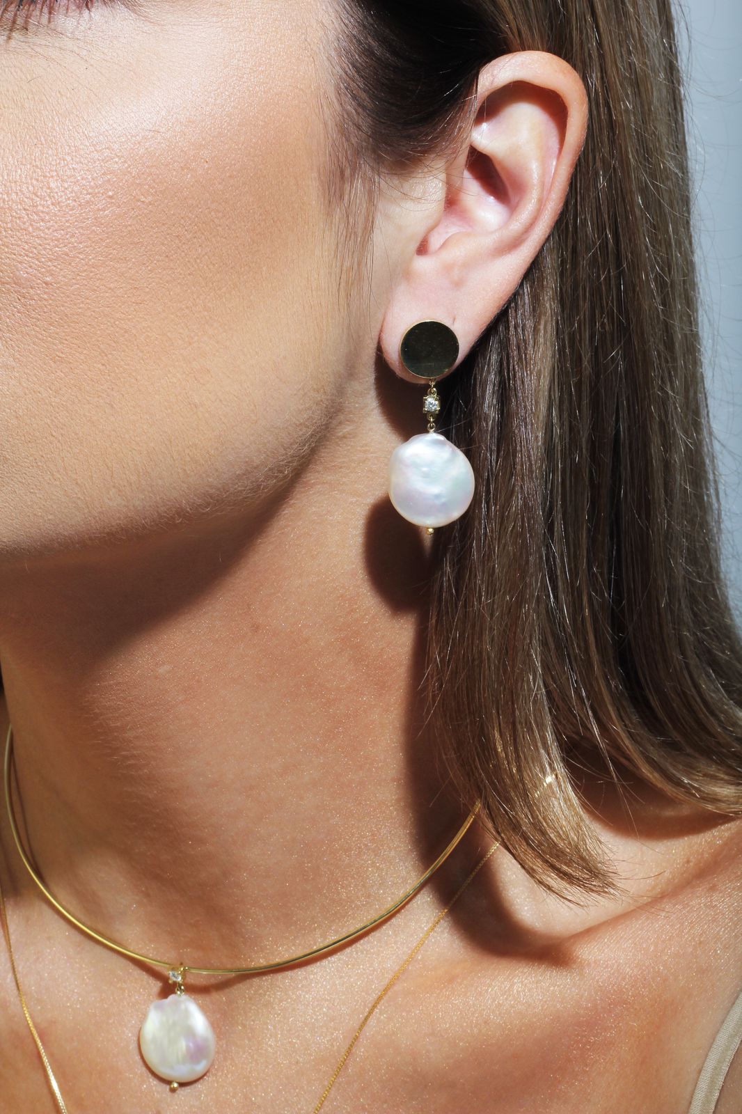 Brinco ouro 18k moeda pérola barroca com brilhante